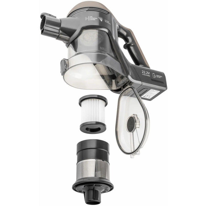 Пилозбірник об'ємом 0,8 л легко спустошується, а три сегменти LED-індикатора наочно показують рівень заряду батареї. Легка, але міцна алюмінієва труба та ергономічний дизайн забезпечують зручність у використанні.