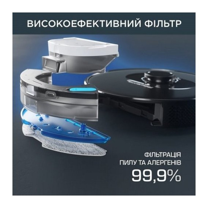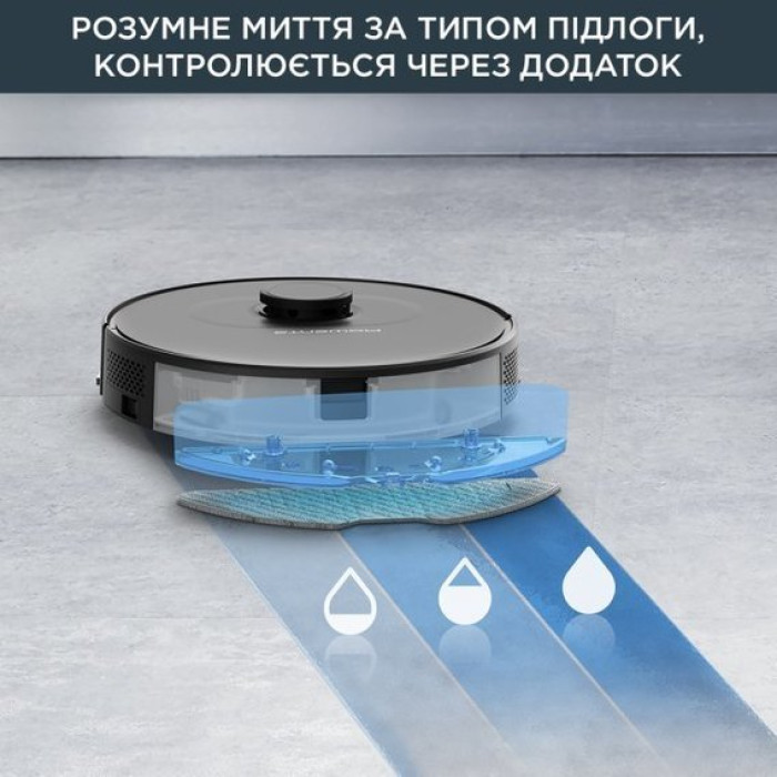 Робот-пилосос забезпечує точність та ефективність прибирання завдяки системі Smart Aqua Power із 4 рівнями подачі води, які можна встановити залежно від типу підлоги. Розумне вологе прибирання на кшталт підлоги.