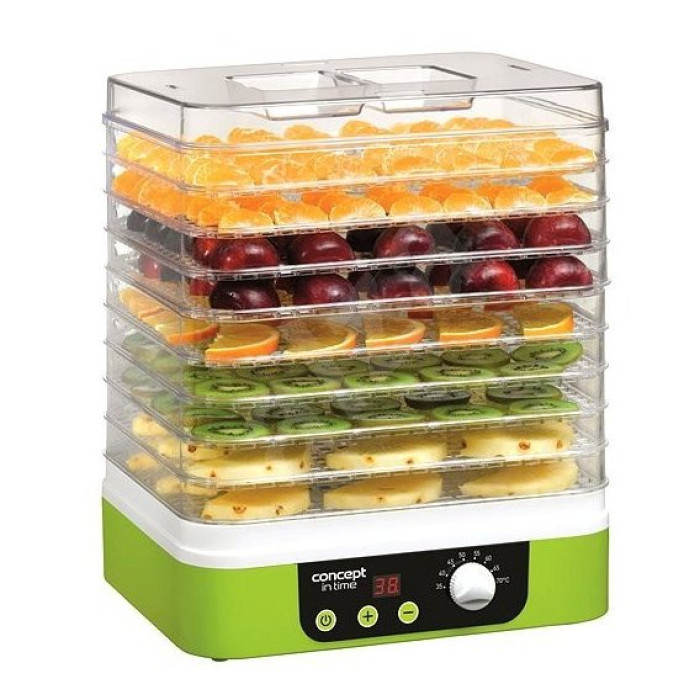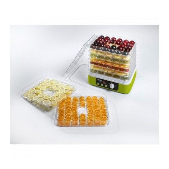 Concept SO 1060 є модель сушарки, за допомогою якої Ви зможете досить швидко висушити різноманітні овочі, фрукти, зелень і ягоди, при цьому в них залишиться максимально корисна кількість вітамінів та інших мікроелементів. Варто зазначити, що під час сушіння, смаки та запахи не перемішуються між собою. Дана модель має 9 прозорих секцій, що дозволить спостерігати за процесом та за один раз переробити велику кількість продуктів. Все, що Вам потрібно, так це нарізати вибрані продукти, розкласти їх за секціями та за допомогою електронного керування встановити потрібний температурний режим. Додатково сушарка має терморегулятор, що дозволяє рівномірно засушувати. Для безпеки Concept SO 1060 має захист від перегріву, а після закінчення циклу сушіння автоматично вимикається, тому Вам залишається насолоджуватися результатом.