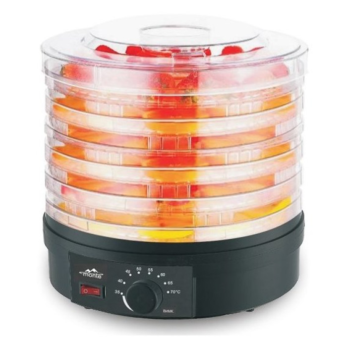 Сушарка електрична Monte MT-1661 призначена для сушіння овочів, ягід, фруктів, квітів, лікувальних трав, приготування мюслі в домашніх умовах. Зовнішній термостат забезпечує плавне регулювання температури, необхідне тим чи іншим продуктам. Сушені продукти можна використовувати для варіння компотів узимку, приготування мюслі, заварювання чаю.