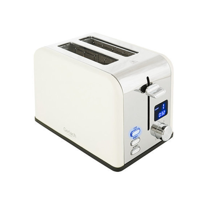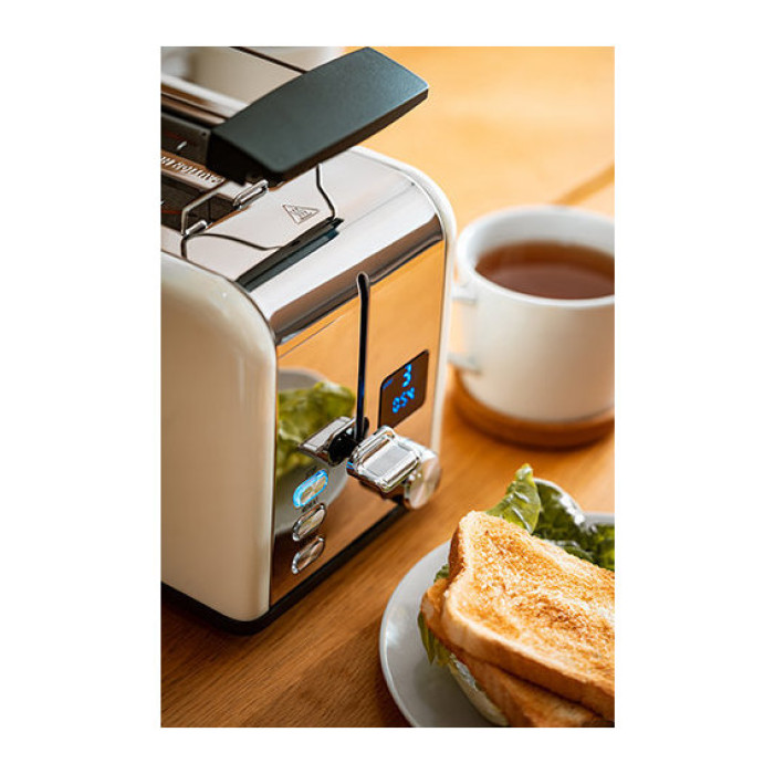 Ефективний тостер із РК-дисплеєм з максимальною потужністю 1100 Вт. Його можна використовувати для одночасного приготування двох тостів. Регулювання потужності підсмажування дозволяє приготувати тости на свій смак. Завдяки цьому вони виходять саме такими хрусткими, якими мають бути. Піддон для крихт дозволяє легко містити пристрій та зону приготування їжі в чистоті. Під час роботи пристрою корпус залишається прохолодним, що підвищує безпеку використання. Приготування тостів можна перервати будь-якої миті, натиснувши кнопку СТОП. Крім того, в тостері є грати для нагрівання рулонів, що збільшує його функціональність, і знімний піддон для крихт.