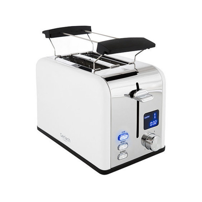Ефективний тостер із РК-дисплеєм з максимальною потужністю 1100 Вт. Його можна використовувати для одночасного приготування двох тостів. Регулювання потужності підсмажування дозволяє приготувати тости на свій смак. Завдяки цьому вони виходять саме такими хрусткими, якими мають бути. Піддон для крихт дозволяє легко містити пристрій та зону приготування їжі в чистоті. Під час роботи пристрою корпус залишається прохолодним, що підвищує безпеку використання. Приготування тостів можна перервати будь-якої миті, натиснувши кнопку СТОП. Крім того, в тостері є грати для нагрівання рулонів, що збільшує його функціональність, і знімний піддон для крихт.