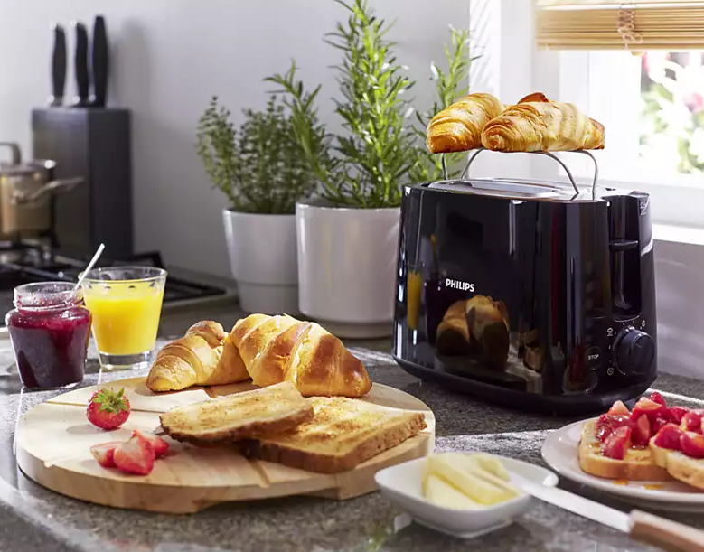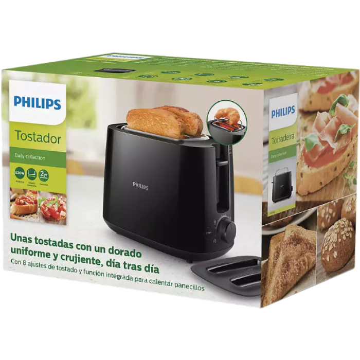 Тостер від голландського бренду світової величини має все необхідне на борту, що може знадобитися в процесі створення підсмажених скибочок хліба. У розпорядження моделі дісталося два місткі слоти з автоцентрування, завдяки чому хлібці різної товщини знаходяться на однаковій відстані від нагрівальних елементів і, відповідно, забезпечується їх рівномірне підрум'янення. Philips HD 2582 працює на потужності до 830 Вт, користувачеві при цьому доступне 8-позиційне регулювання ступеня підсмажування тостів. Також у моделі передбачені функції розігріву та розморожування, є кнопка скасування, а в конструкцію включені підставка для підігріву булочок та знімний піддон для крихт простого очищення. Не зайвим буде згадати спеціальний витяг, що дозволяє легко діставати скибочки хліба невеликого розміру. Тостер Philips Daily Collection HD2582/90 має компактний дизайн у елегантному чорному кольорі. У комплекті тостера є пилозахисна кришка. Зрештою, на варту додаткового захисту приладу від короткого замикання поставлено систему автовідключення.