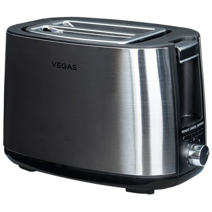 Тостер Vegas VET-2003S виконаний у стильному варіанті оформлення, в якому головну роль на себе взяв сріблястий колір. Більшість корпусу зроблена з нержавіючої сталі, що має глянсову фактуру. Контраст створюється темними пластиковими деталями, що загалом утворює досить органічний образ. На передній частині корпусу розташовано регулятор поворотного типу. Його використовують для налаштування рівня піджарювання. Усього вам доступно 7 варіантів інтенсивності. Поруч із перемикачем є кнопки, які відповідають за вибір конкретного режиму роботи техніки. Крім того, що ви можете підсмажити тости всередині цього побутового приладу, можна скористатися додатковими опціями підігріву та розморожування. Їхні спільні риси полягають у тому, що вони не мають такого сильного термічного впливу, як при обсмажуванні, дозволяючи вам підготувати шматочки хліба, булочки або рогалики до вживання.