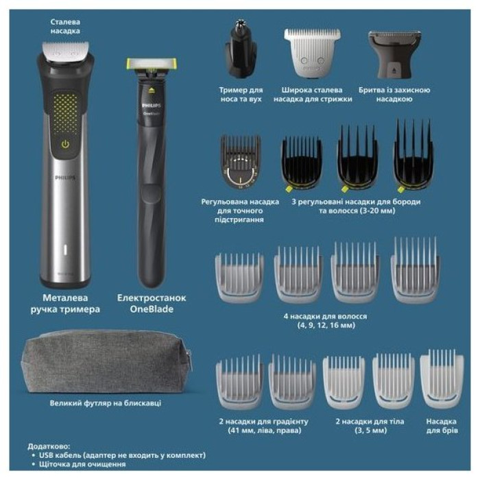 Цей універсальний набір стайлера призначений для різноманітного догляду за волоссям: надійний триммер забезпечить точне та потужне підрівнювання волосся на обличчі, голові та тілі, а OneBlade завдяки унікальній технології ідеально підійде для підрівнювання та гоління волосся будь-якої довжини на обличчі. Леза тримера із нержавіючої сталі завжди залишаються гострими для стабільної ефективності. Без змащування.