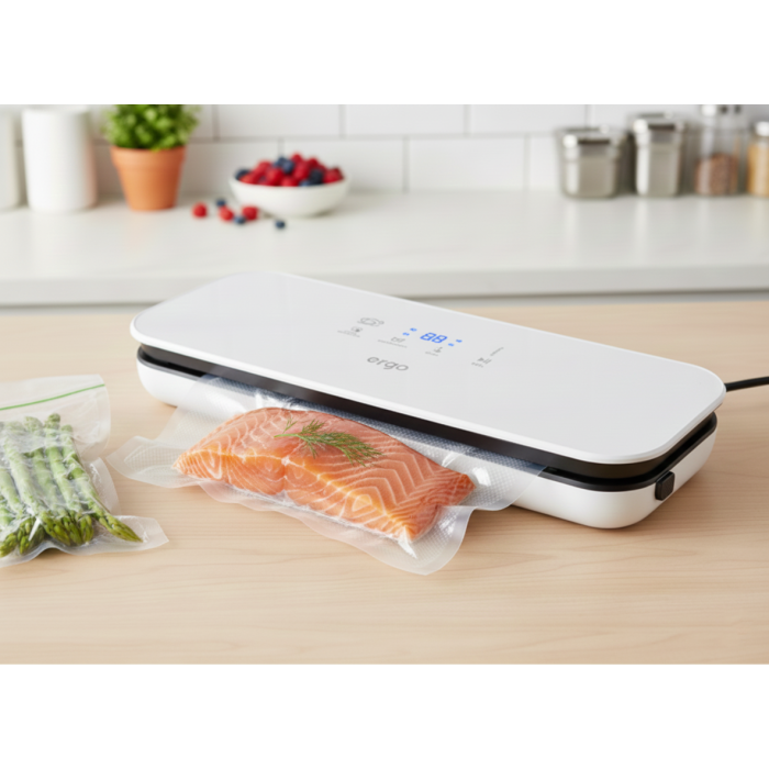 Вакууматор ERGO VS 2030 призначений для видалення повітря зі спеціальних рифлених пакетів або з харчових контейнерів. Завдяки вакуумуванню м’ясо, риба, овочі, фрукти та тісто значно довше зберігаються свіжими як в охолодженому, так і в замороженому вигляді. Також вакууматор ERGO можна використовувати для маринування й ферментування різноманітних продуктів або навіть запаювання в поліетилен документів для захисту від вологи.