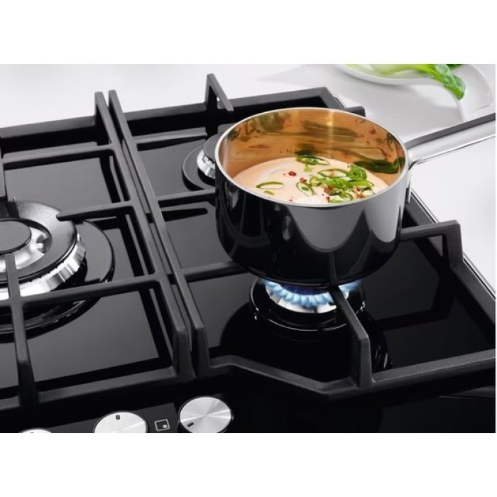 Газова варильна поверхня Electrolux KGG6456K - це стильна і сучасна модель, яка по праву займе центральне місце на вашій кухні. Завдяки нестандартному розташуванню конфорок поверхня виглядає яскраво і помітно, крім того ви зможете ставити на поверхню одночасно кілька громіздких каструль або сковорідок, які не зіштовхуватимуть одна одну. Грати цієї варильної поверхні мають спеціальну конструкцію, яка дозволить легко пересувати навіть важкий посуд, не піднімаючи його. Зручні мітки на решітках допоможуть розмістити посуд так, щоб конфорка була безпосередньо по центру.