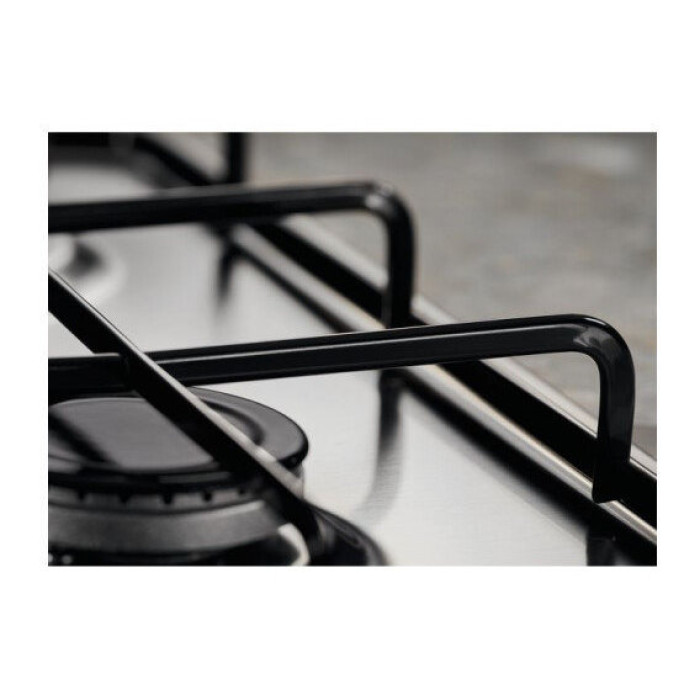 Нержавіюча сталь, 4 конфорки, електрозапалювання автоматичне, газ-контроль, емальовані грати, ширина 59.5 см, довжина кабелю 1.1м., вага нетто 8 кг.