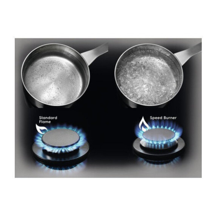 Передня ліва зона нагріву: 3000 Вт/100 мм, Задня ліва зона: середня горілка, 2000 Вт/70 мм, Передня права зона: мала горілка, 1000 Вт/54 мм, Задня права зона: середній пальник 2000 Вт/70 мм.