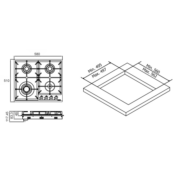 ELEYUS ALMERA 60 BL обладнана чотирма конфорками: 2,5 кВт швидкої дії – 1 шт., 1,0 кВт допоміжної дії – 1 шт, 1,7 кВт напівшвидкої дії – 2 шт. Надійні та практичні поворотні перемикачі унеможливлюють випадкове ввімкнення, адже спочатку потрібно натиснути на перемикач, а потім повернути його. Розміщення перемикачів нижче рівня решіток запобігає нагріванню та контакту з гарячим посудом.