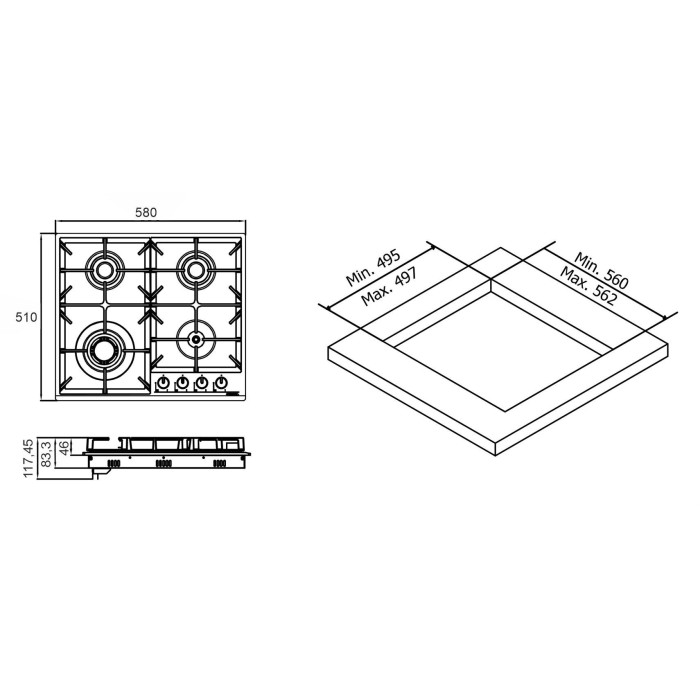 Газова варильна поверхня виготовлена з високоякісної нержавіючої сталі, простої у догляді. Поверхня обладнана 2-ма надійними, міцними та стійкими чавунними решітками. Форма решіток дозволяє помістити на поверхні посуд різного діаметру.