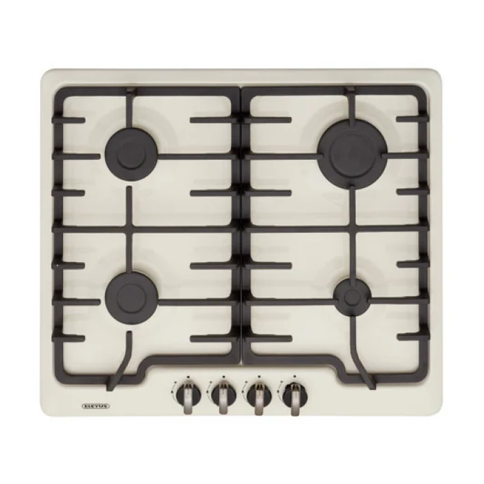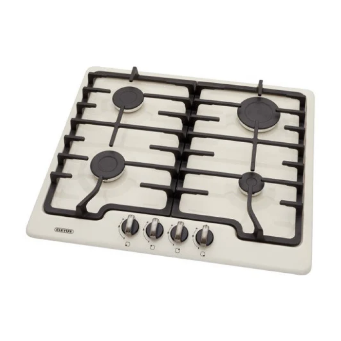 Газова незалежна варильна поверхня, емаль, 4 конфорки, електрозапалювання автоматичне, газ-контроль, поворотні перемикачі з блокуванням на передній частині панелі, чавунні грати. Комплектується жиклерами як для підключення до газової магістралі, так і газового балона (додатковий комплект жиклерів)