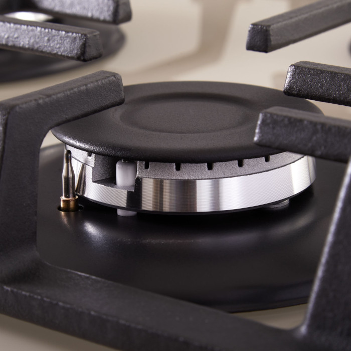 Великий пальник потужністю 2,6 кВт, віддалений від інших, і дозволяє готувати у великій каструлі, широкій сковороді або навіть гусятниці. Напівшвидку конфорку 1,7 кВт краще використовувати для гасіння. У той час як на маленькій конфорці 1 кВт зручно заварювати каву в турці або розтоплювати олію в сотейнику.