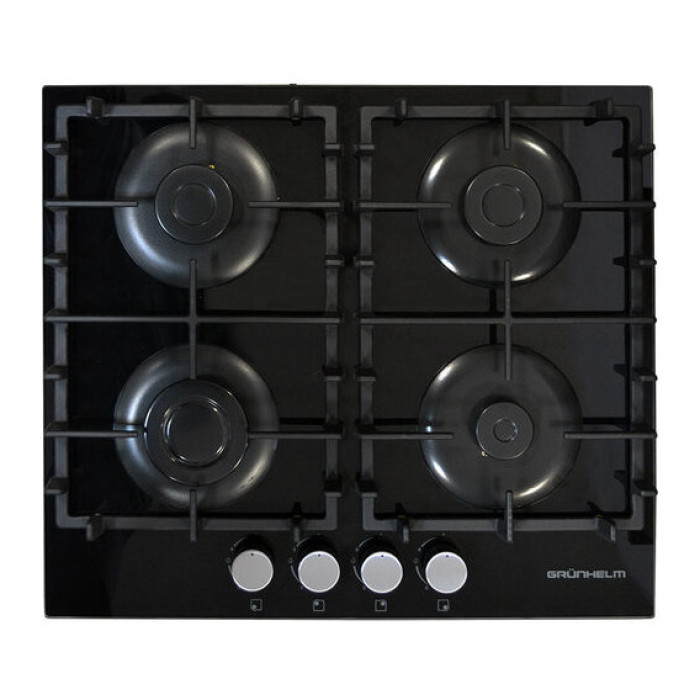 Газова варильна поверхня Grunhelm GPG 6214 BF виготовлена у сучасному дизайні у стильному чорному кольорі. Модель покрита високоміцною термостійкою емаллю, яка легко очищається від харчових забруднень. Прилад обладнаний чотирма конфорками. Усі пальники оснащені системою електричного запалювання. Керується газова варильна поверхня Grunhelm GPG 6214 BF чотирма ергономічними циліндричними перемикачами кольору нержавіючої сталі, розташованими праворуч. Натискання викликає електричну іскру, що підпалює відповідну конфорку. Подальшим поворотом перемикача встановлюється бажаний рівень полум'я.