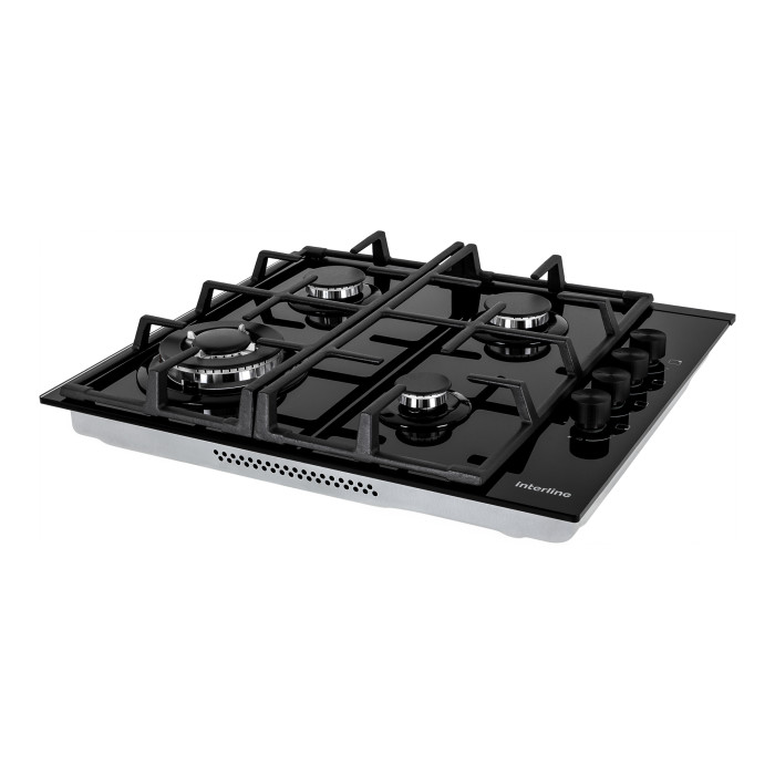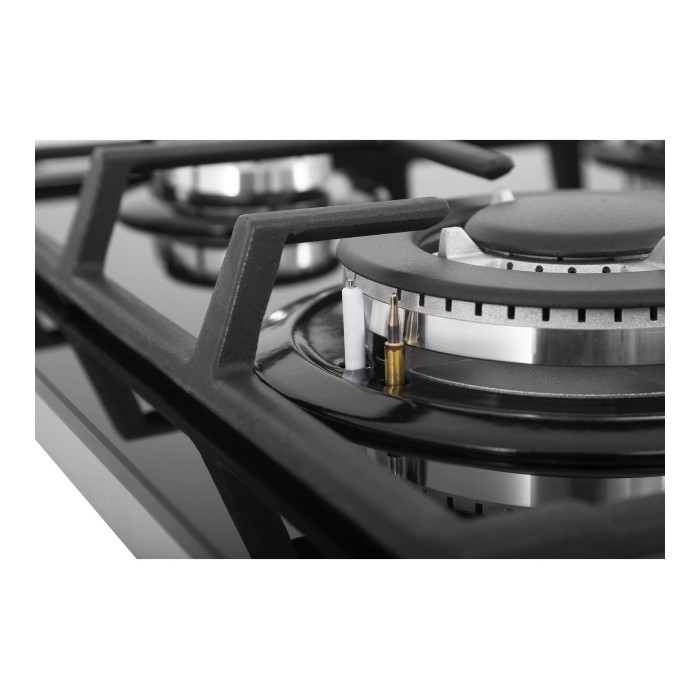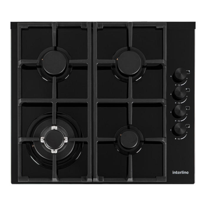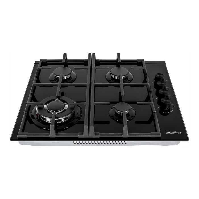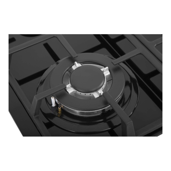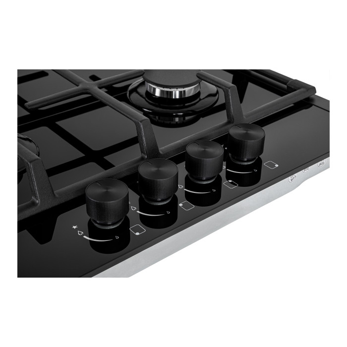Газова варильна поверхня з панеллю з чорного гартованого скла, чудово виглядатиме на будь-якій кухні. За нею легко доглядати, а чавунні міцні ґрати будуть надійною опорою навіть для найважчої каструлі.