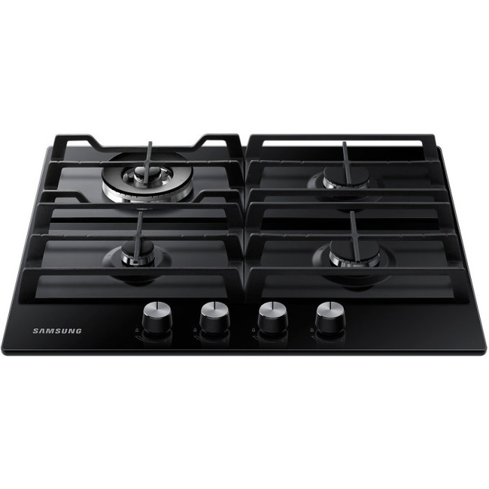Варильна газова поверхня Samsung NA64H3030AK/WT випускається в сучасному дизайні в практичному і строгому чорному кольорі. Вона покрита загартованим склом і містить 4 конфорки різного розміру та потужності. Крім економічної та двох середніх пальників, у моделі є WOK-конфорка потужністю 3,8 кВт із трьома рядами полум'я. Остання конфорка служить для швидкого приготування їжі в габаритних каструлях та сковорідках, а також для приготування азіатської кухні. Усі пальники оснащені функцією електричного запалювання та обладнані захисною системою газ-контролю. Щоб розміщувати посуд, над конфорками встановлені стильні чавунні грати, що мають міцність і стійкість. Нею можна безпечно переміщати каструлі та сковорідки, не піднімаючи їх, а для особливої WOK-посуду в комплект поставки входить додаткові спеціальні грати. Керується газова варильна поверхня Samsung NA64H3030AK/WT ергономічними поворотними перемикачами на передній панелі.