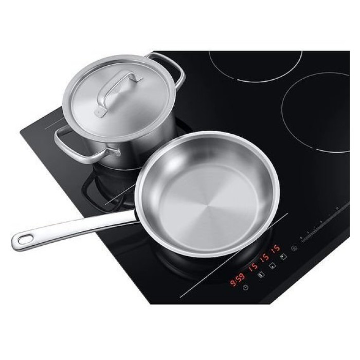 Варильна поверхня електрична Samsung NZ64R3747BK виробляється в сучасному дизайні в практичному чорному кольорі. На її робочій поверхні, виконаній зі склокераміки, знаходяться чотири конфорки. Дві з них можуть об'єднуватися, утворюючи зону Flex Zone, що настроюється, яка дозволяє використовувати габаритний або довгастий посуд, щоб готувати відразу великі обсяги їжі. Усі конфорки моделі обладнані індукційними нагрівальними елементами. Активація функції Quick Start призводить до прискореного розігріву відповідної зони, а технологія SuperBoost збільшує її потужність. Вбудований індикатор залишкового тепла вбереже від опіку, а також вкаже конфорку, що ще не охолола, на якій можна продовжувати приготування їжі. Керується електрична варильна поверхня Samsung NZ64R3747BK сенсорними кнопками із слайдерною температурною шкалою. Система безпеки автоматично відключить прилад, якщо тривалий час не змінюються налаштування або посуд залишений на конфорці після приготування страви.