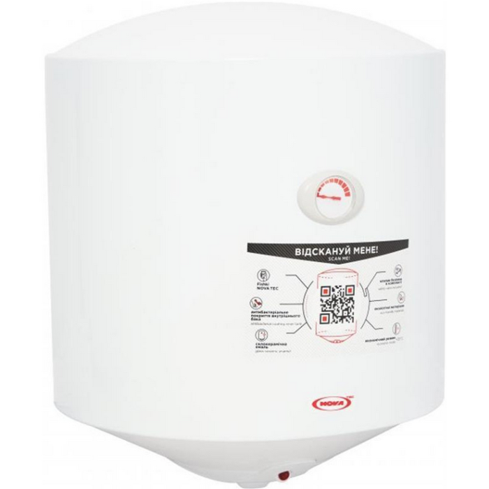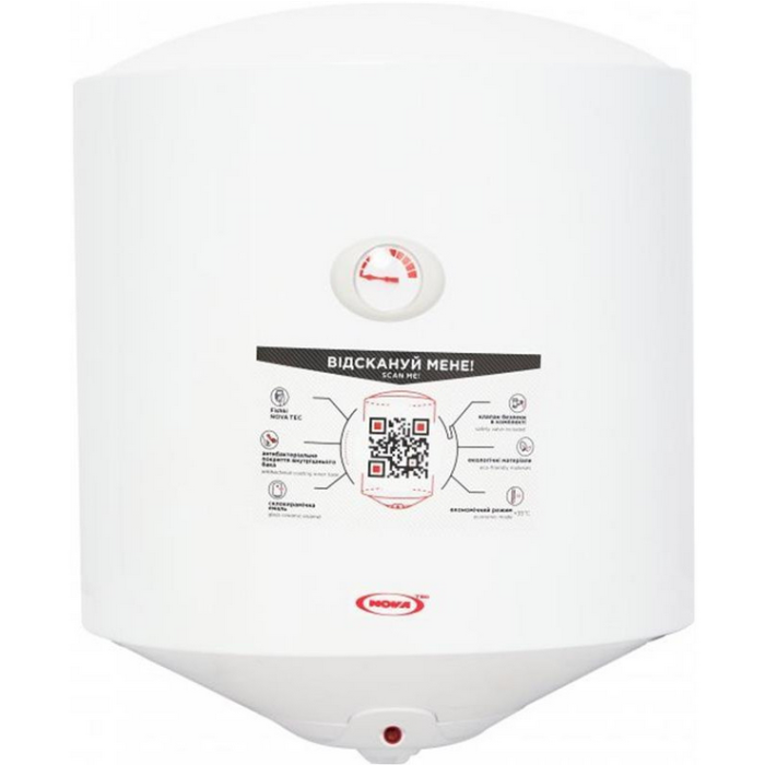 Водонагрівач Nova Tec NT-DD 50 відноситься до типу електричних накопичувальних моделей з високим ступенем безпеки ефективною роботою. Nova Tec NT-DD 50 здатний нагрівати воду об'ємом 50 л до 77 градусів, для чого йому знадобиться 2 години. Дана модель розрахована на вертикальну установку та настінний тип монтажу, при якому варто врахувати його круглу форму, розміром 580х461 мм, вага в 17 кг та необхідність нижнього підведення труб. Не можна не відзначити високу якість виконання та надійність матеріалів, що використовуються для його виробництва, які забезпечать йому тривалий термін служби, а допоможе в цьому внутрішнє покриття бака титановою емаллю, ефективний захист від перегріву та запобіжний клапан, а також магнієвий діод. Не викличе складнощів у процесі експлуатації Nova Tec NT-DD 50 механічне керування, а стрілочний термометр дозволить відстежити температурний режим.
