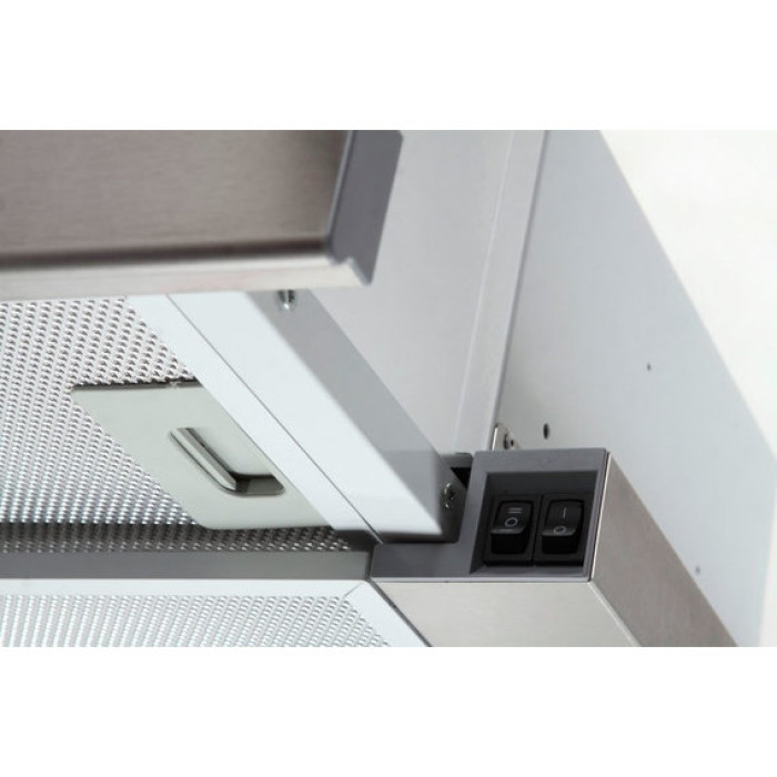Двопозиційний вимикач світла дозволяє вмикати та вимикати світло, як за допомогою висувної панелі, так і за допомогою самого вимикача. Висувна панель забезпечить додаткове втягування. Встановивши цю витяжку, ви одразу відчуєте, що таке справжня продуктивність.