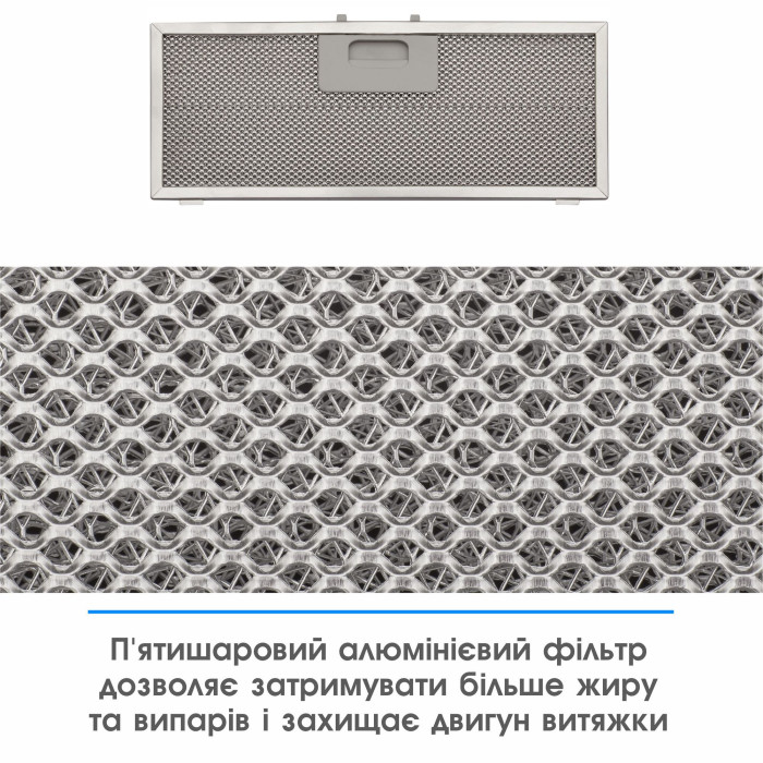 Надійний 5-шаровий алюмінієвий фільтр поглинає дрібні частинки жиру та захищає двигун витяжки. Для легкого очищення достатньо вийняти його і помити в гарячій воді або посудомийній машині.