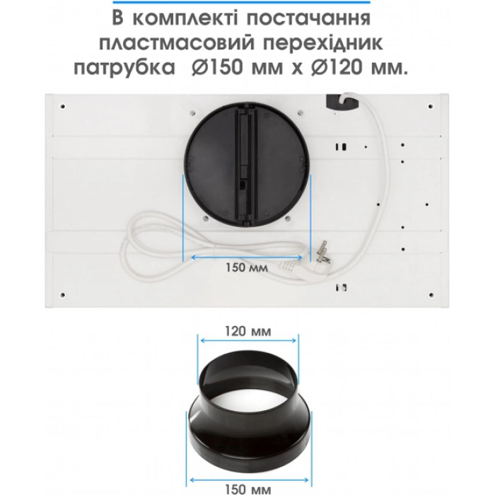 Витяжка повністю вбудовується у звичайну кухонну шафку шириною 60 см. Видимою залишається тільки передня панель з нержавіючої сталі, стійка до вологи та високих температур. Лаконічний дизайн витяжки гармонійно поєднується з кухнею та в стилі мінімалізм, хай-тек чи модерн.