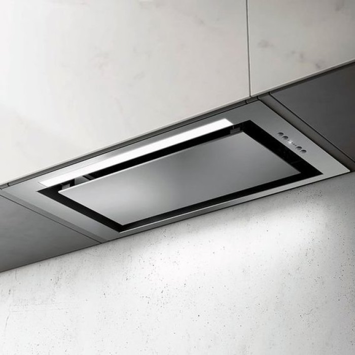 Повітряний потік, що містить аерозолі, пари їжі, продукти згоряння, входить крізь прямокутну щілину корпусну 714х282 мм і далі фільтрується. Тоді витяжка підтримує свіжу кухонну атмосферу, чистими меблевими поверхнями. Високу освітленість на рівні конфорок плити забезпечує світлодіодна стрічка. Розташовані вздовж вузького боку пристрою кнопки дозволяють змінювати інтенсивність освітлення, обертання вентилятора. Горизонтально розташований фасад не спотворює загальне сприйняття дизайну приміщення.