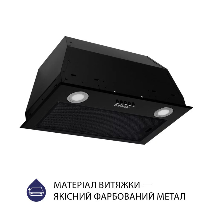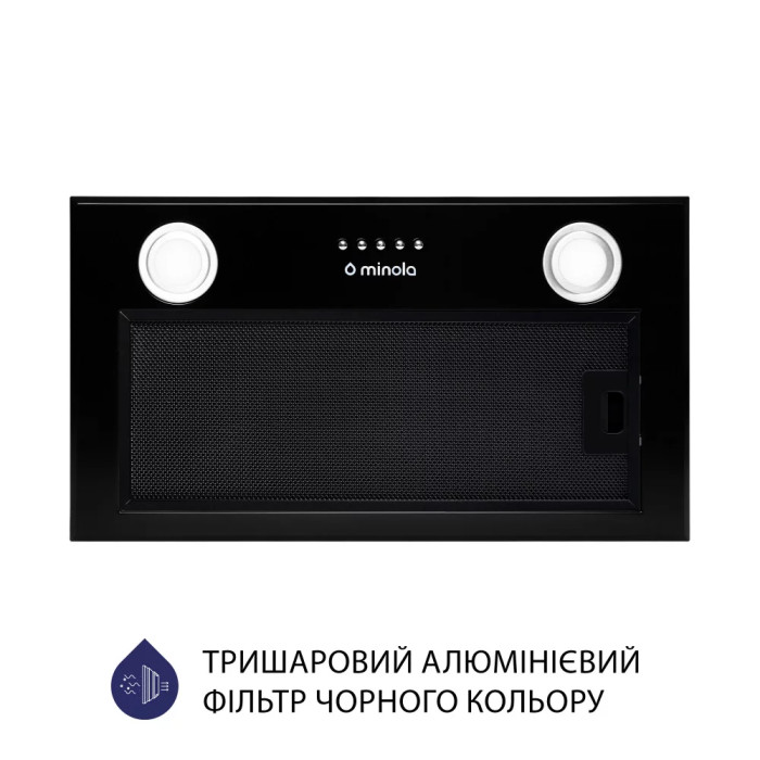 Кухонна витяжка Minola HBI 5222 BLF 700 LED обладнана тришаровим жировим алюмінієвим фільтром чорного кольору. Він забезпечує надійний і ефективний захист двигуна та інших деталей витяжки від потрапляння жиру та бруду.