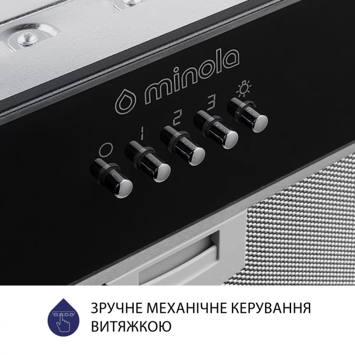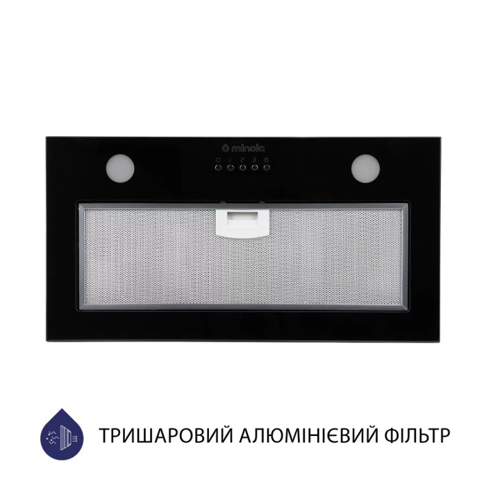 Кухонна витяжка Minola HBI 5262 BL GLASS 700 LED обладнана тришаровим жировим алюмінієвим фільтром. Він забезпечує надійний та ефективний захист двигуна та інших деталей витяжки від потрапляння жиру та бруду.