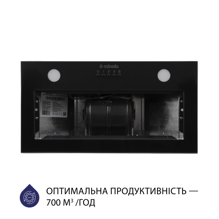 Повновбудована кухонна витяжка Minola HBI 52621 BL GLASS 700 LED обладнана одним двигуном оптимальною потужністю 100 Вт. Максимальна продуктивність пристрою у режимі відведення повітря становить 700 м3/годину. Це дозволяє ефективно видаляти випари, небажані запахи та кіптяву, які утворюються в процесі приготування їжі.