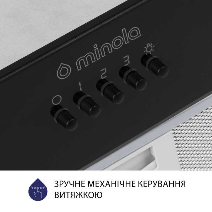 Кухонна витяжка Minola HBI 52621 BL GLASS 700 LED обладнана тришаровим жировим алюмінієвим фільтром. Він забезпечує надійний і ефективний захист двигуна та інших деталей витяжки від потрапляння жиру та бруду.