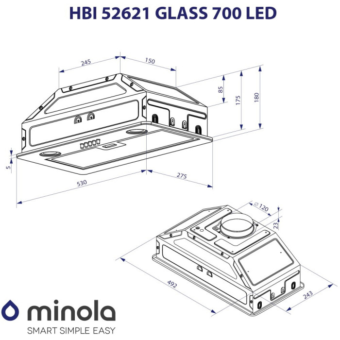 Кухонна витяжка Minola HBI 52621 GLASS 700 LED оснащена одним двигуном оптимальною потужністю 100 Вт. Максимальна продуктивність пристрою в режимі відведення повітря складає 700 м3/година. Це дозволяє ефективно видаляти випари, небажані запахи та кіптяву, які утворюються в процесі приготування їжі. Витяжка обладнана тришаровим жировим алюмінієвим фільтром. Він забезпечує надійний та ефективний захист двигуна та інших деталей витяжки від попадання жиру та бруду. Панель управління з 5 механічними кнопками перемикання швидкостей та увімкнення освітлення розташована посередині на передній частині пристрою. Вона проста в управлінні та інтуїтивно зрозуміла. Витяжка обладнана двома круглими LED-лампами потужністю 1 Вт кожна. Світлодіодні лампи, розташовані під декоративним склом, забезпечують комфортне додаткове освітлення кухонної поверхні, залишаючись найбільш економічним джерелом світла.