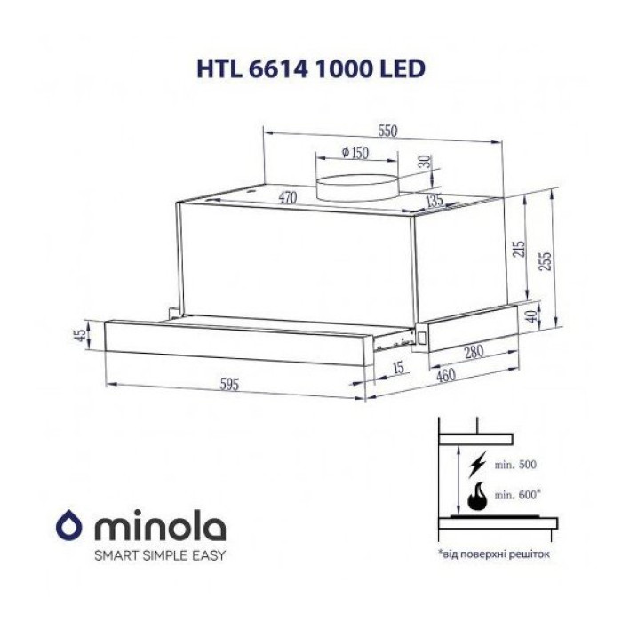 Minola HTL 6614 функціональна, компактна та стильна витяжка. Оформлена в сірому металевому кольорі, вона підійде для будь-якого дизайну кухні, відмінно впишеться в кожен інтер'єр. Витяжка вбудовується в кухонну шафу, тому не займає багато місця. Ширина її складає 60 см, це стандартний показник для такого виду побутової техніки.