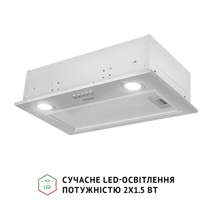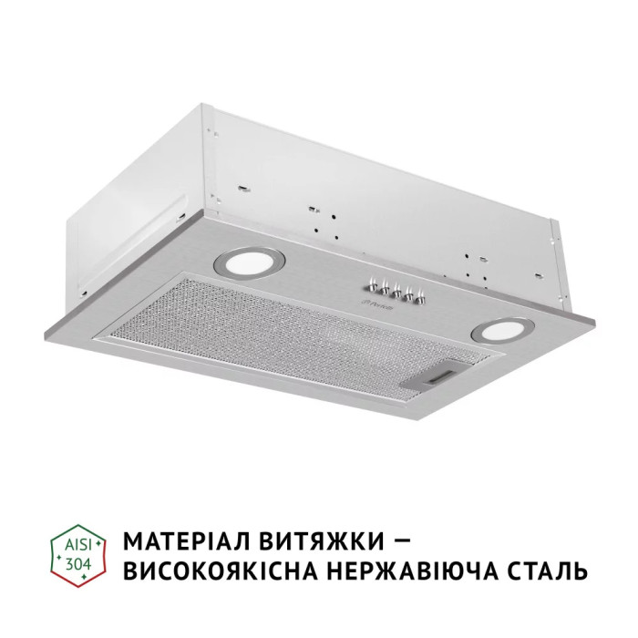 мотор потужністю 80 Вт; вугільний фільтр, який відповідає за очищення повітря (його можна придбати окремо); алюмінієвий фільтр – затримує кіптяву та випари; надійне механічне управління; сучасне LED-освітлення у вигляді двох ламп.