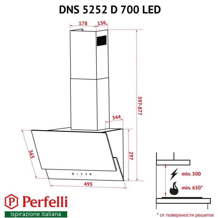 Похила пристінна кухонна витяжка Perfelli DNS 5252 D 700 SG LED має ергономічні властивості та має компактну ширину 49.5 см, тому дозволяє раціонально використовувати простір у зоні над варильною поверхнею.