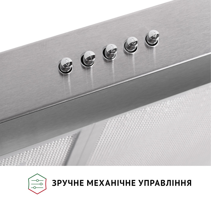 Керувати витяжкою – зручно та легко. На передній панелі розташоване кнопкове механічне керування, де знаходяться кнопки перемикання швидкостей роботи витяжки, увімкнення освітлення та відключення приладу.
