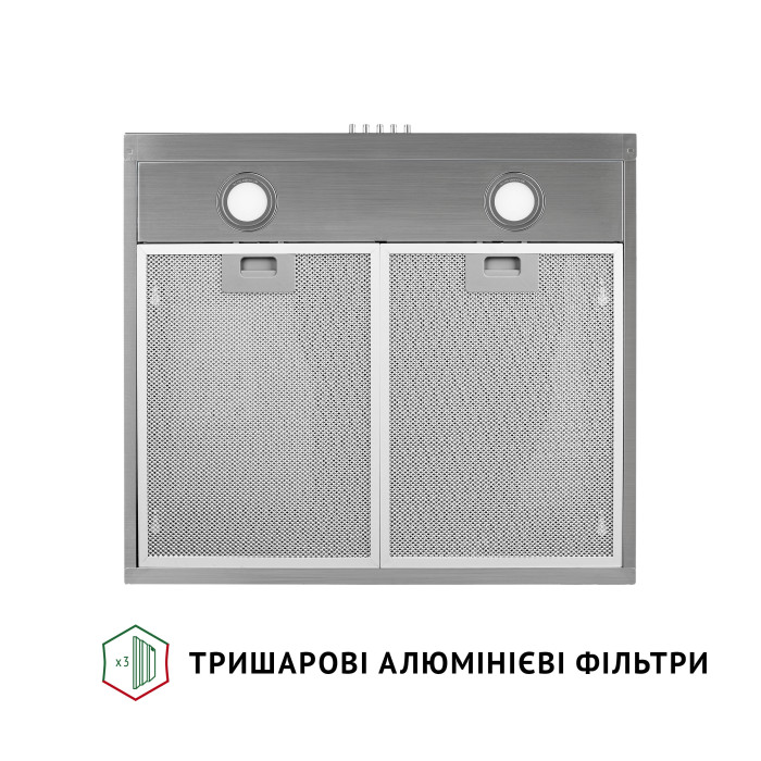Витяжка обладнана двома тришаровими алюмінієвими фільтрами, що ефективно захищають двигун та інші деталі пристрою від забруднення жиром та випарами.