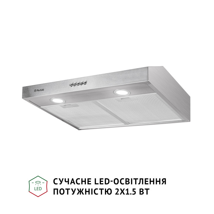 Кухонна витяжка Perfelli PL 5002 LED працює на трьох швидкостях, що дозволяє вибирати потрібну інтенсивність очищення повітря, залежно від його забрудненості.