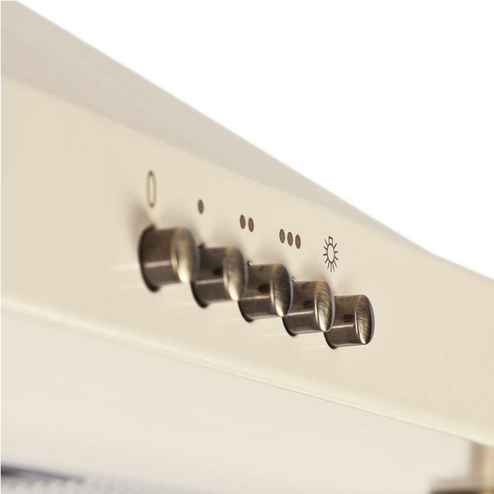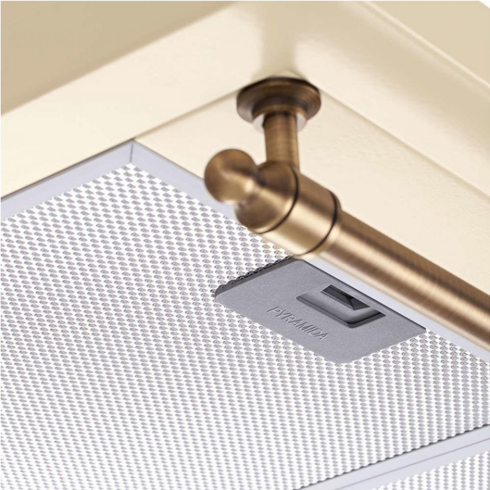 Купольна витяжка Pyramida KH 60 RUSTICO ivory монтується на стіну та має чіткі грані корпусу, ідеально доповнені бронзовим релінгом та кнопками, що дозволяє додавати створеному стилю неповторності, оригінальності та захоплення. Pyramida KH 60 RUSTICO ivory відмінно працює як у режимі відведення через повітропровід діаметром 150 мм, так і в режимі рециркуляції, для чого у витяжці попередньо встановлені п'ятишарові алюмінієві фільтри для більш якісного затримання жиру та передбачена додаткова опція для фільтру тонкого очищення. Кнопкова система, розміщена на передній панелі, забезпечує легке та зрозуміле керування, а дві галогенові лампочки по 40 Вт потужністю гарантують чудову видимість робочих кухонних поверхонь.