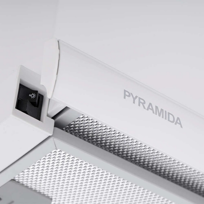 Pyramida TL 60 (1100) white відрізняється високим показником продуктивності та максимальною простотою в керуванні. Вона вбудовується безпосередньо в кухонну шафку над газовою або електричною плитою, може працювати як проточна модель з відведенням повітря з приміщення у вентиляційну систему будинку, або як витяжка з рециркуляцією, має висувну панель. У базовому комплекті постачання виробник передбачив жировий фільтр та антиповоротний клапан. Вугільні фільтри для функціонування у другому режимі купуються окремо за додаткову плату. Pyramida TL 60 (1100) white має 3 швидкості і оснащена двома потужними лампами. За годину вона здатна очистити до 1100 м3. повітря.