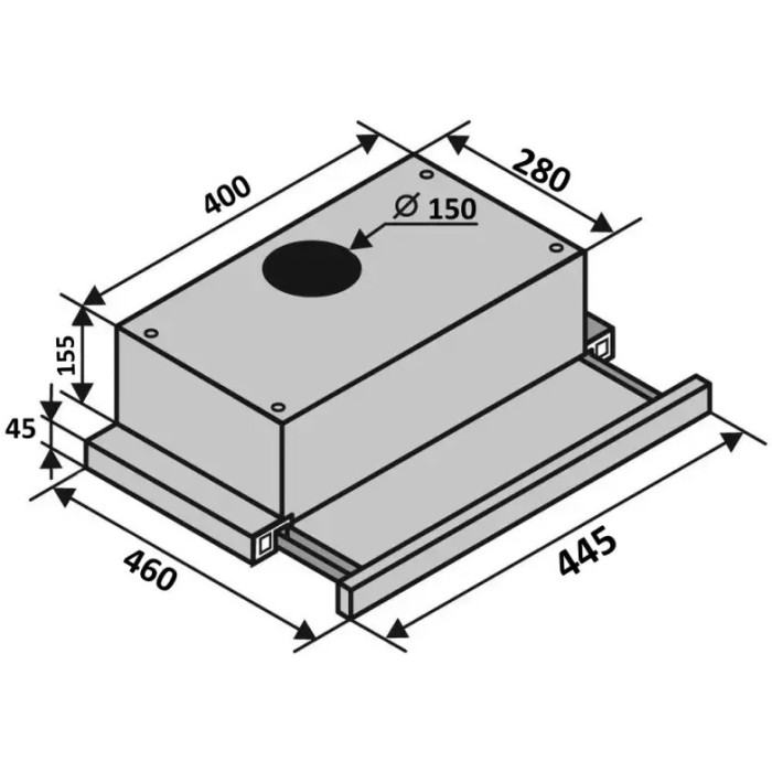 Для комфортної роботи варильної поверхні витяжка обладнана двома LED-лампами по 1 Вт, які забезпечують яскраве та економічне освітлення. Усередині встановлений один двигун потужністю 65 Вт, діаметр повітроводу становить 150 мм, глибина – 28 см, висота – 20 см. Корпус виконаний з металу з емальованим декоративним покриттям.