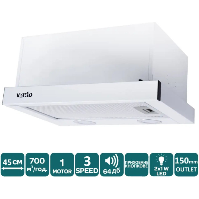 Витяжка Ventolux GARDA 45 WH (700) LED – це компактна телескопічна вбудована витяжка у білому кольорі, призначена для монтажу у кухонну шафу. Завдяки ширині 44,5 см вона оптимально підходить для невеликих кухонь площею до 8 м², забезпечуючи ефективне очищення повітря під час приготування їжі.