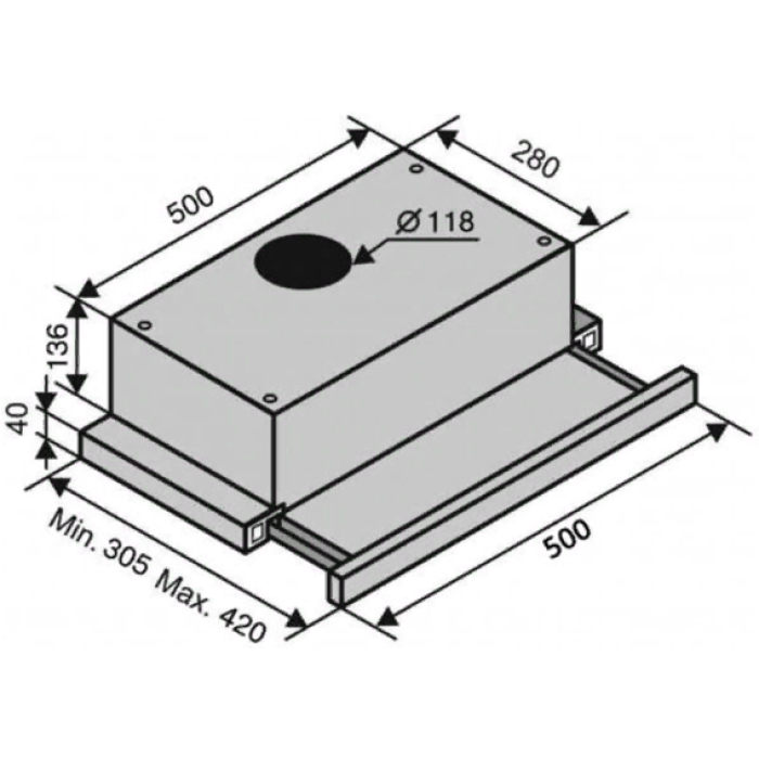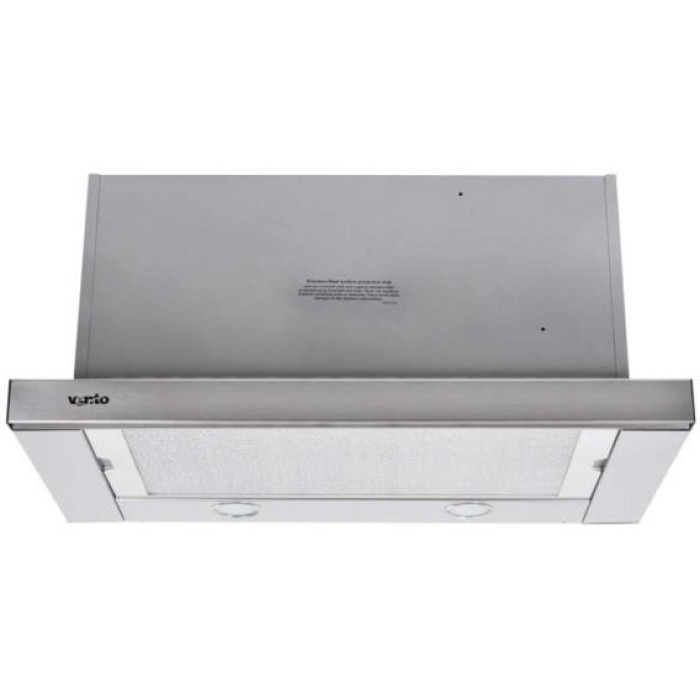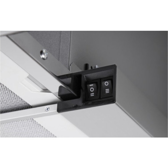 Дана витяжка має нейтральний дизайн, який не має особливих яскравих акцентів – все пристосовано для акуратної та незаметної інтеграції. Кнопочний блок також не виділяється на загальному фоні – він прикриває видну частину пристрою. Каждая з кнопок має кілька положень, в яких їх можна зафіксувати. Такий тип управління максимально прост і даст вам можливість максимально швидко освоїтися з витяжкою.