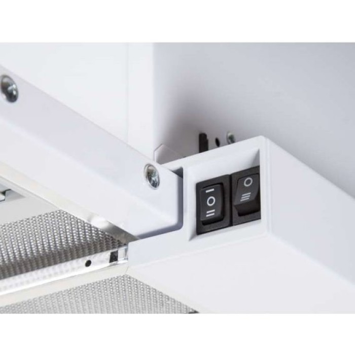 Ця витяжка має нейтральний дизайн, який не має особливих яскравих акцентів – все пристосоване для акуратної та непомітної інтеграції. Кнопковий блок також не виділяється на загальному тлі - він прихований висувною частиною пристрою. Кожна кнопка має кілька положень, в яких її можна зафіксувати. Такий тип управління максимально простий і дасть вам можливість швидко освоїтися з витяжкою.