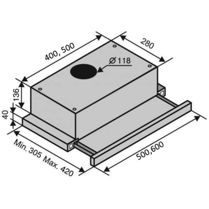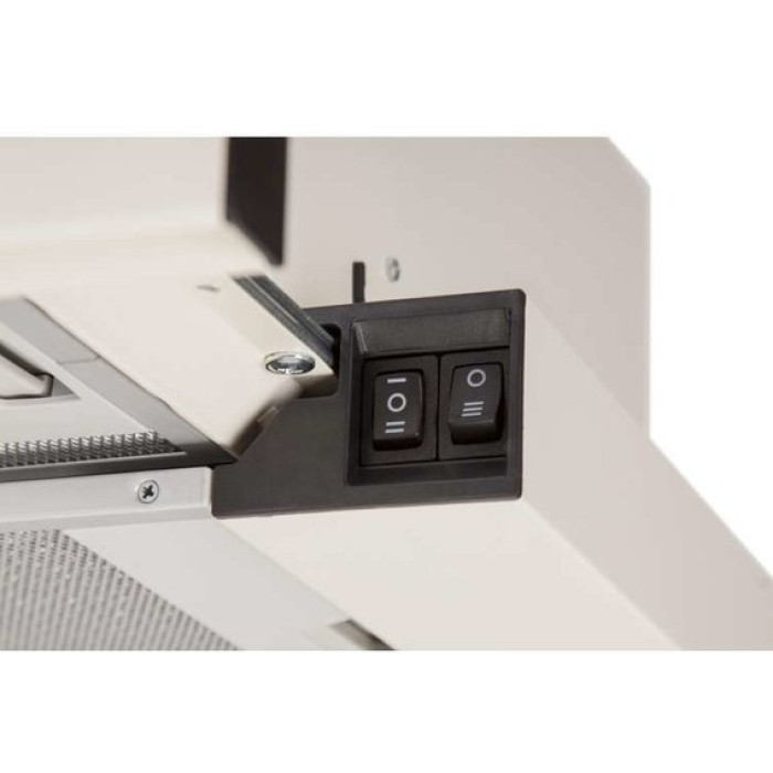 Телескопічна витяжка Ventolux GARDA 60 CREMA (700) SLIM є пристроєм, що вбудовується в кухонні меблі – видимими залишається тільки нижня висувна панель. Прилад виготовлений у корпусі з міцної та довговічної нержавіючої сталі. Він призначений для кухонь площею 20,5-28,5 кв.м і функціонує в режимі відведення забрудненого повітря або рециркуляції (за наявності вугільного фільтра, який купується окремо). Повітряний потік направляється у вентиляційний канал по повітропроводу діаметром 118 мм. Керується модель клавішними перемикачами, розташованими за висувною частиною. Це зручне конструкторське рішення дозволяє після встановлення бажаних параметрів надалі розпочинати роботу з вибраними налаштуваннями. Максимальна продуктивність 3-швидкісного двигуна потужністю 153 Вт досягає 700 куб.м на годину. Телескопічна витяжка Ventolux GARDA 60 CREMA (700) SLIM оснащена галогенною лампою потужністю 28 Вт для додаткового підсвічування робочої зони.