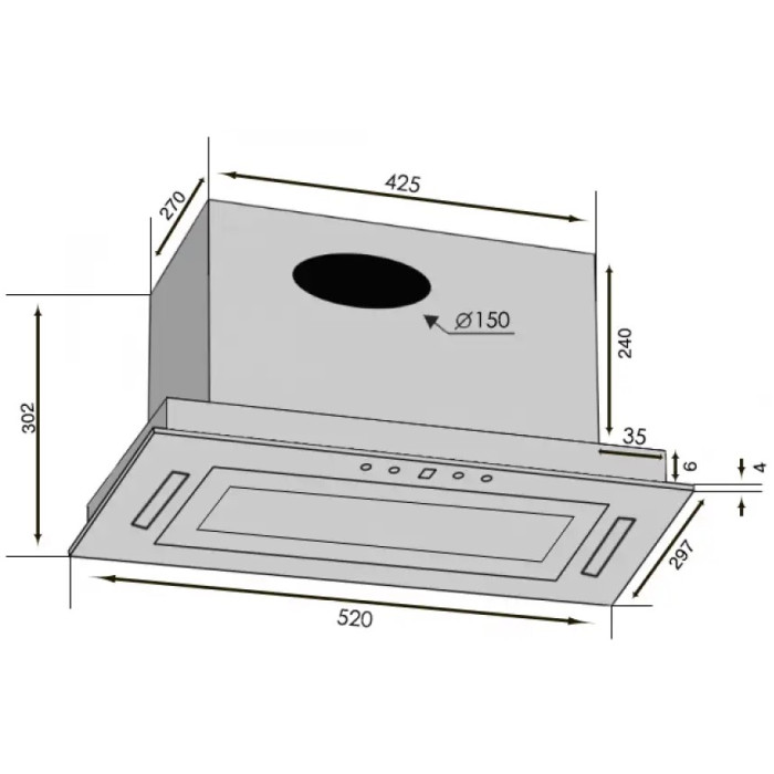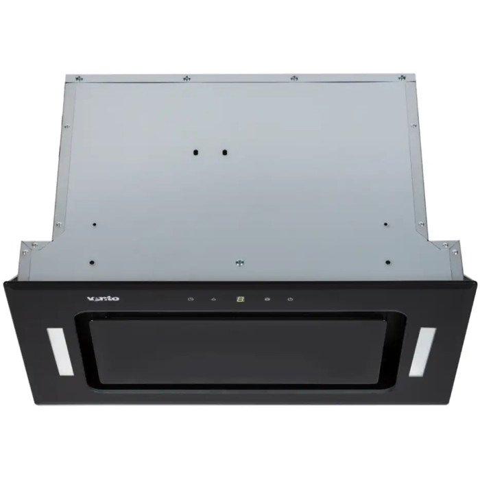 Повновбудована витяжка чорного кольору шириною 52 см має продуктивність 1400 м³/год та працює в режимі відведення. Оснащена сенсорним керуванням, трьома швидкостями, одним мотором, таймером та пультом дистанційного керування. Рівень шуму становить 71 дБ, діаметр вихідного отвору – 150 мм. Освітлення постачають дві світлодіодні лампи по 1 Вт. У комплекті є витяжка, інструкція, гарантійний талон, зворотний клапан, пульт дистанційного керування, шнур живлення з вилкою, металевий та алюмінієвий жировий фільтр.