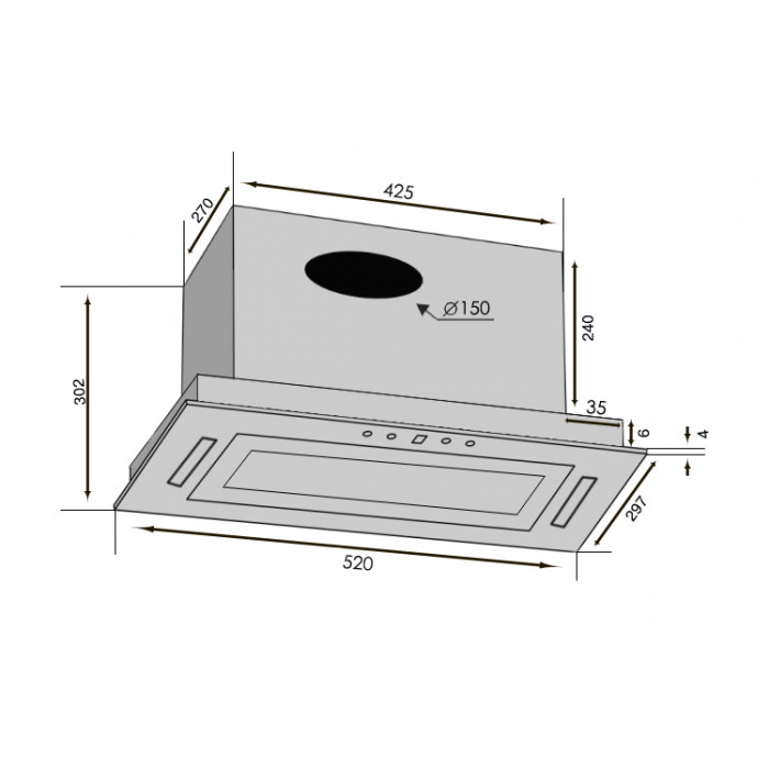 Модель PUNTO 60 BG (1200) TRC JET входить в категорію повно вбудованих витяжок, які користуються популярністю за рахунок того, що повноцінно монтується в кухонні меблі і тим самим надає мінімальний вплив на інтер'єр кухні. Особливості цієї витяжки – гарний декор нижньої частини чорним склом, сенсорне керування та пульт, наявність функції таймера та розташування LED ламп з боків нижньої частини моделі.