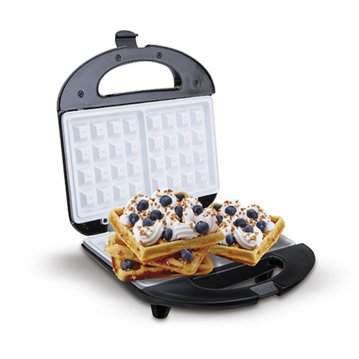 Вафельниця потужністю 1000 Вт, оснащена термостатом. Ідеально підходить для приготування хрустких вафель. Готує 2 вафлі одночасно. Він оснащений пластинами з білим керамічним покриттям, що робить очищення дуже легким. Його також дуже легко транспортувати завдяки зберіганню шнура та можливості стояти вертикально.