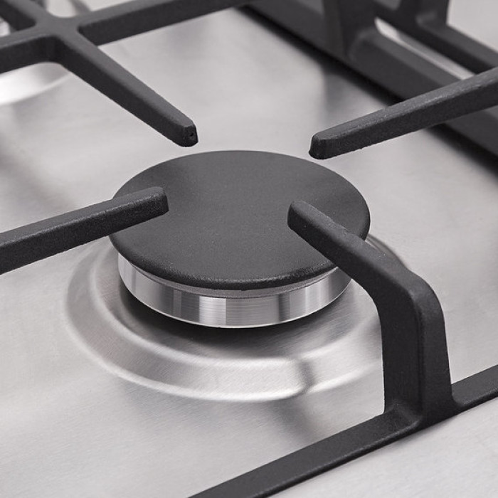Форма стола – правильный прямоугольник. Конфорки имеют традиционное расположение. Панель управления фронтальная. Блестящая нержавеющая сталь. Решетки из крепкого чугуна. Помимо этого варочная поверхность производится из премиальной нержавеющей стали марки 304 с высоким индексом механической твердости. Она стойко переносит мелкие механические повреждения.