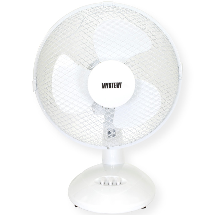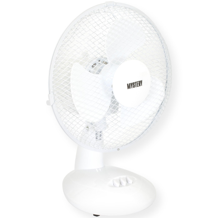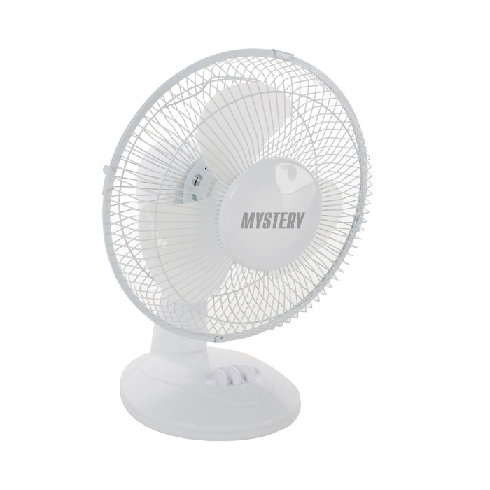 Настільний вентилятор білого кольору, з двома швидкостями та потужністю 30 Вт.