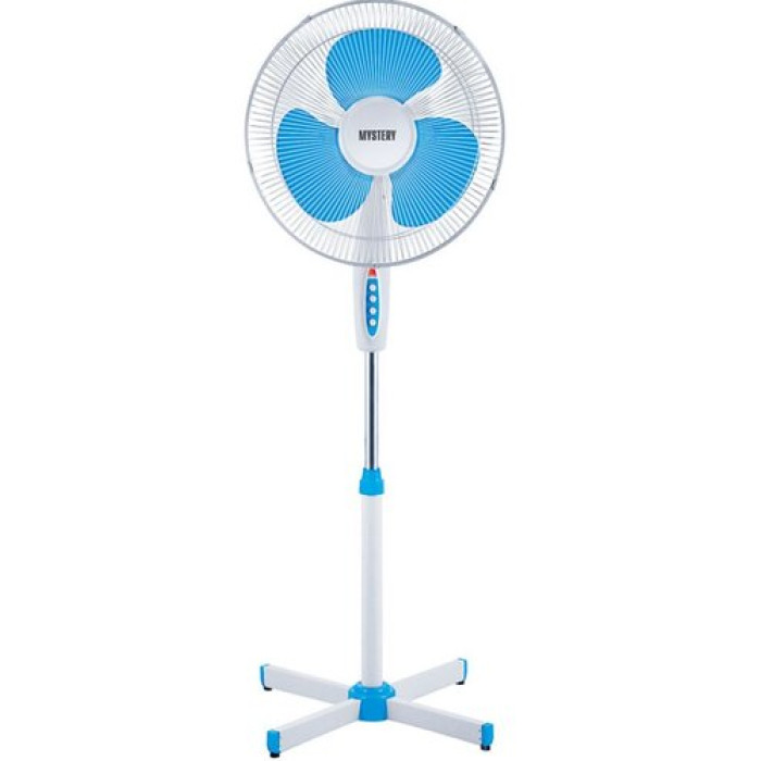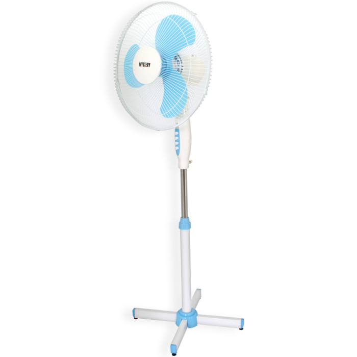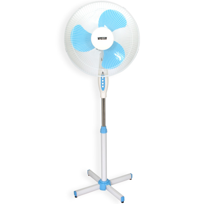 Підлоговий вентилятор біло-синього кольору з трьома швидкостями та потужністю 40 Вт.